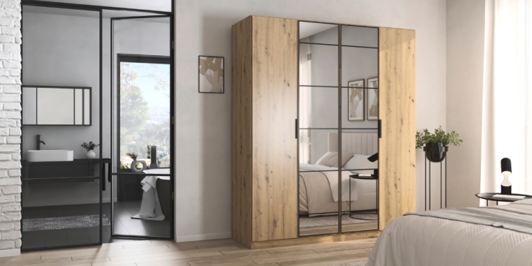 The Ashfield range of wardrobes features an Artisan Oak finish combined with stylish sectioned mirror doors to create a unique look that will suit a wide range of bedrooms. Paired with stylish metallic grey handles to highlight the colour and mirrors, these wardrobes can be as large a 6 door hanging wardrobe or as small as a 2 door shelved cabinet.