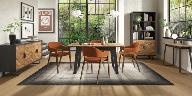 The Elton Dining Collection features striking patterns of saw cut rustic oak tops & facias, displayed against wire brushed peppercorn finished frames