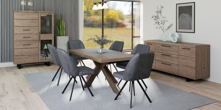 The Fox dining range features a variety of dining tables, made with oak tops and a darkened finish in 3 different styles. Choose from a simple U-leg design, star leg base in either black metal or matching wood, or the more contemporary star base extending "pop up" table. Extension leafs are available separately for the regular tables, allowing further utility and convenience. Paired with soft padded...