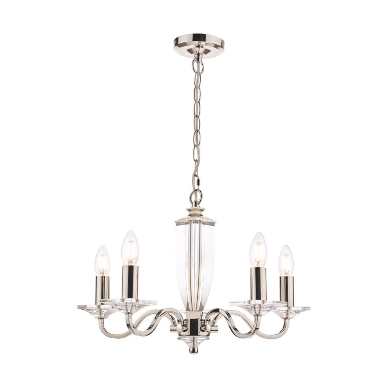 The Laura Ashley Carson 5 light Chandelier is a massive statement piece to any room. With its five curved Polished Nickel arms, beautiful clear cut crystal centre piece & square crystal candle dishes. Complete with a matching finish ceiling rose and hanging chain plus a clear cable .