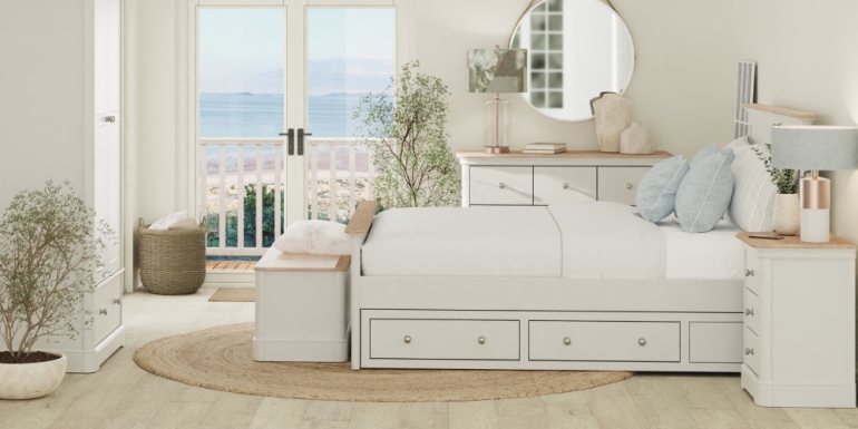 The Lavenham Blanket Box features a large storage space perfect for anything from clothes to toys. Boasting traditional style and smooth curved edges, this piece can be finished in a range of colours and wood options allowing it to suit a wide range of bedrooms.