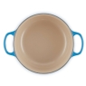 The Le Creuset Azure range displays a deep blue colour that rises up into a lighter shade to create a beautiful look. The essential kitchen classic. From a fifteen minute pasta ragu to a slow-cooked, fragrant stew; from tender, juicy roasts to freshly baked bread and cakes that rise to perfection and bake evenly, the Round Cast Iron Casserole is ideal for a wide array of one-pot recipes.