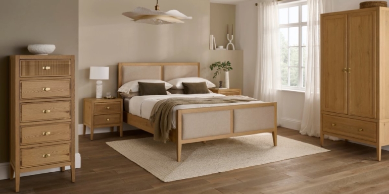 The Lyon bedroom furniture range features a solid oak and oak veneer construction with a unique reeding effect highlighting parts of the available pieces. The bed frames come with an upholstered headboard and foot end while brass handles, soft close drawers & hinges with the oak finished in matt lacquer combine to bring a feeling of luxury to this range, making it an excellent addition to a wide range of bedrooms.