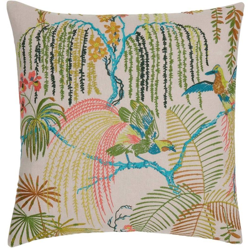 This design’s curving foliage makes for a bedroom oasis, with its elegant arrangement of palm leaves and silhouetted shadows in tranquil shades of botanical green. The feather filled cushion has a cotton embroidered bird and foliage design which adds a feel of nature to the bedroom.
