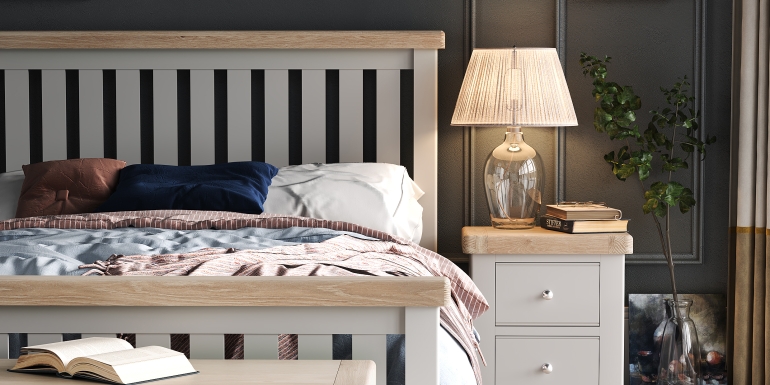 Blending traditional design with mordern sensibility. Solid oak and oak veneers are skillfully used to create a quality, warming range of bedroom furniture that can easily suit a range of homes. Finished in Stone Grey paint with the natural finish of oak tops and highlights across the range, even coming with a choice of handle fittings, the Sauton range makes for an excellent choice.