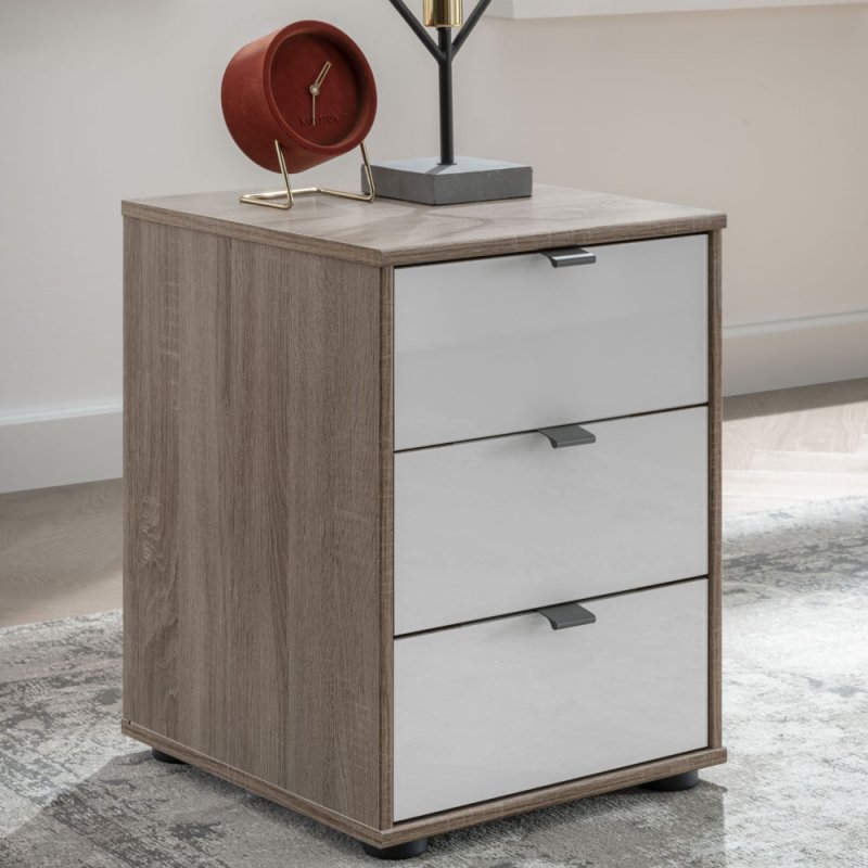 - Tannington 3 drawer bedside chest with champagne glass fronts and dark rustic oak carcase