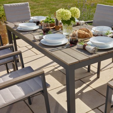 The Umbria collection is modern yet casual with it’s distinctive design. The Umbria is quick-drying and easy to maintain. Made with the highest quality fabric spun from recycled plastic bottles, the fabric is also hard wearing and UV resistant. The attractive tree-free features, gives the appearance of real wood, with the benefit of a lightweight material, which is rust free, meaning you can make as many memories in your outdoor space for years to come.